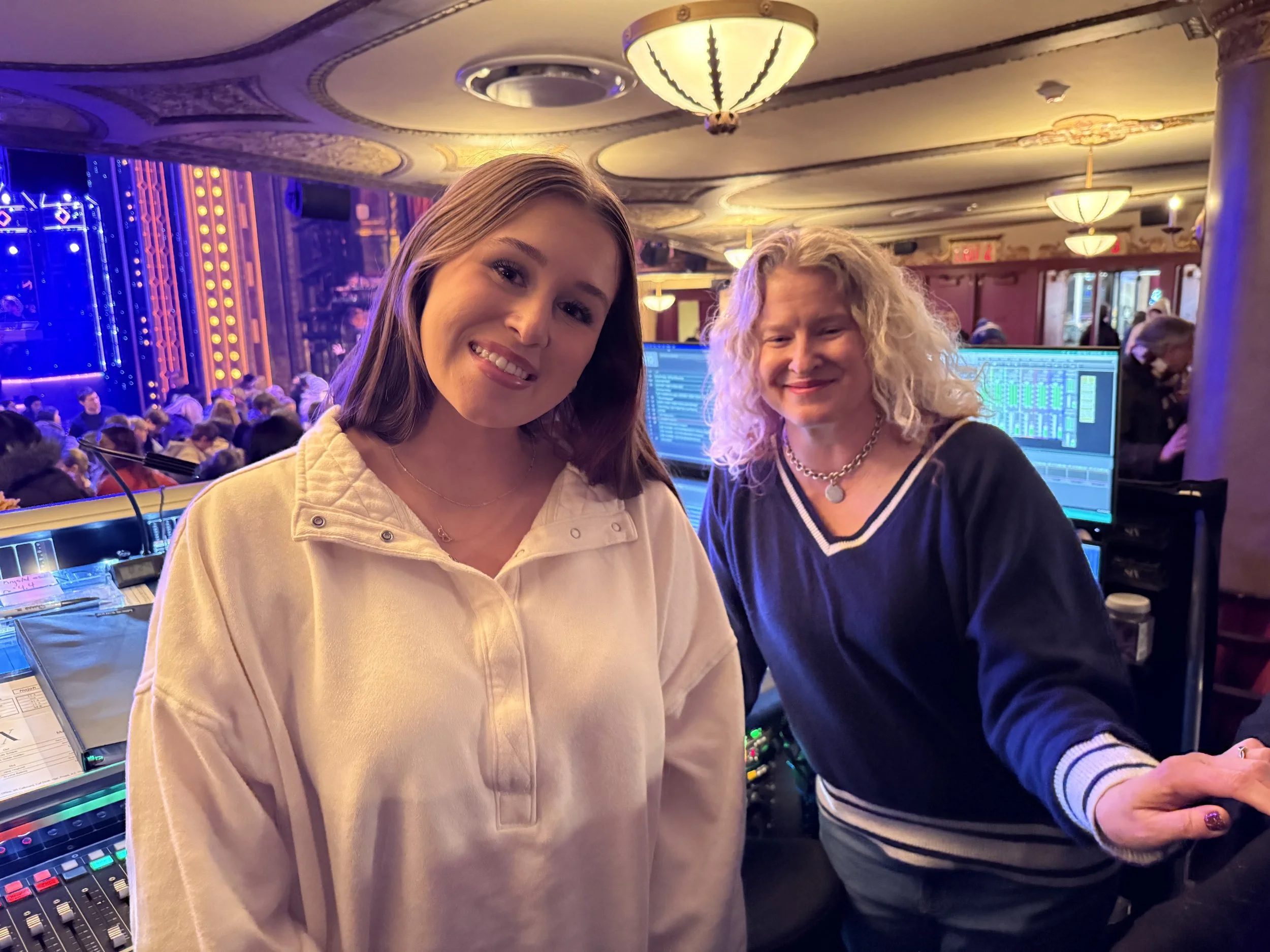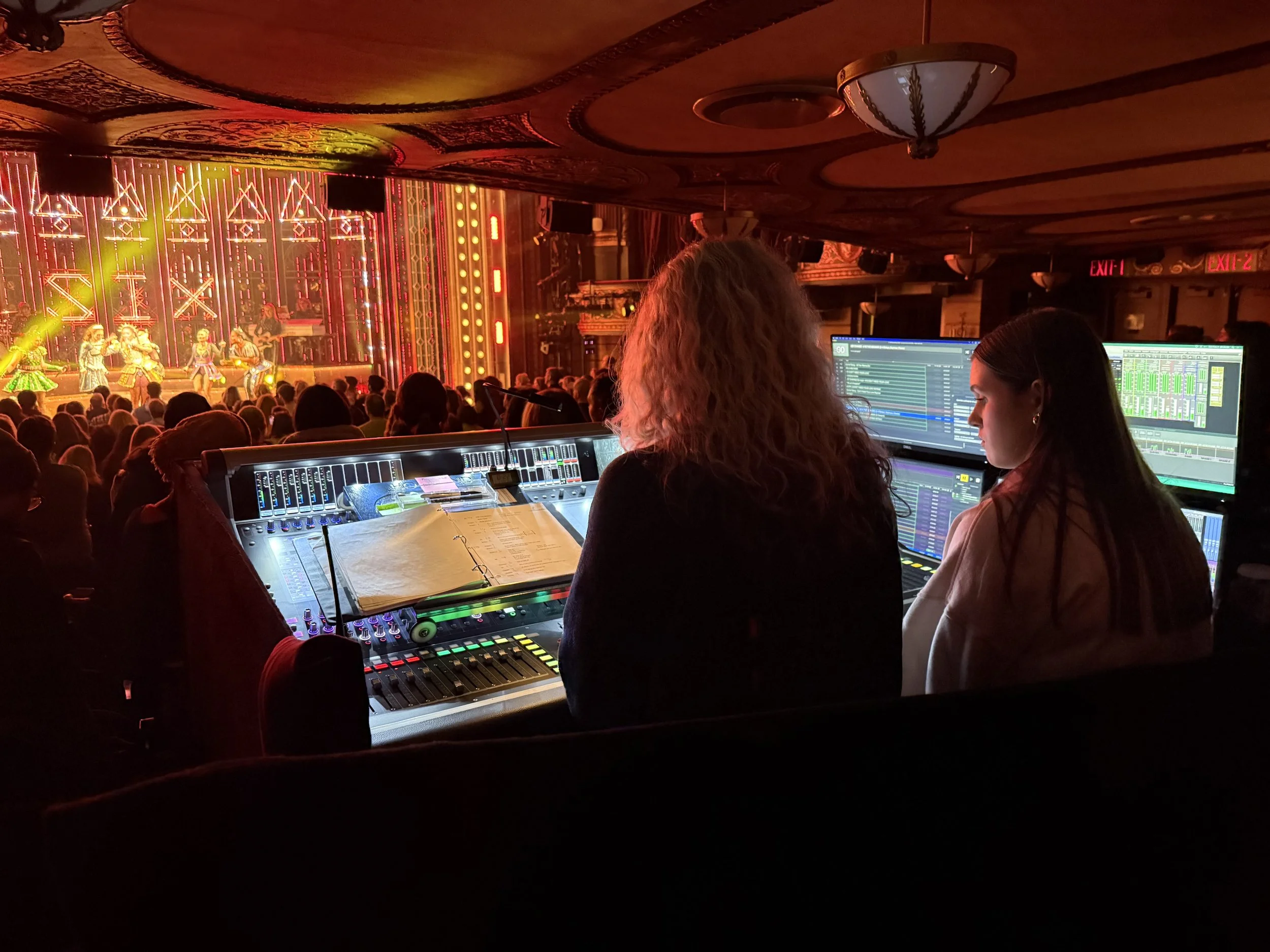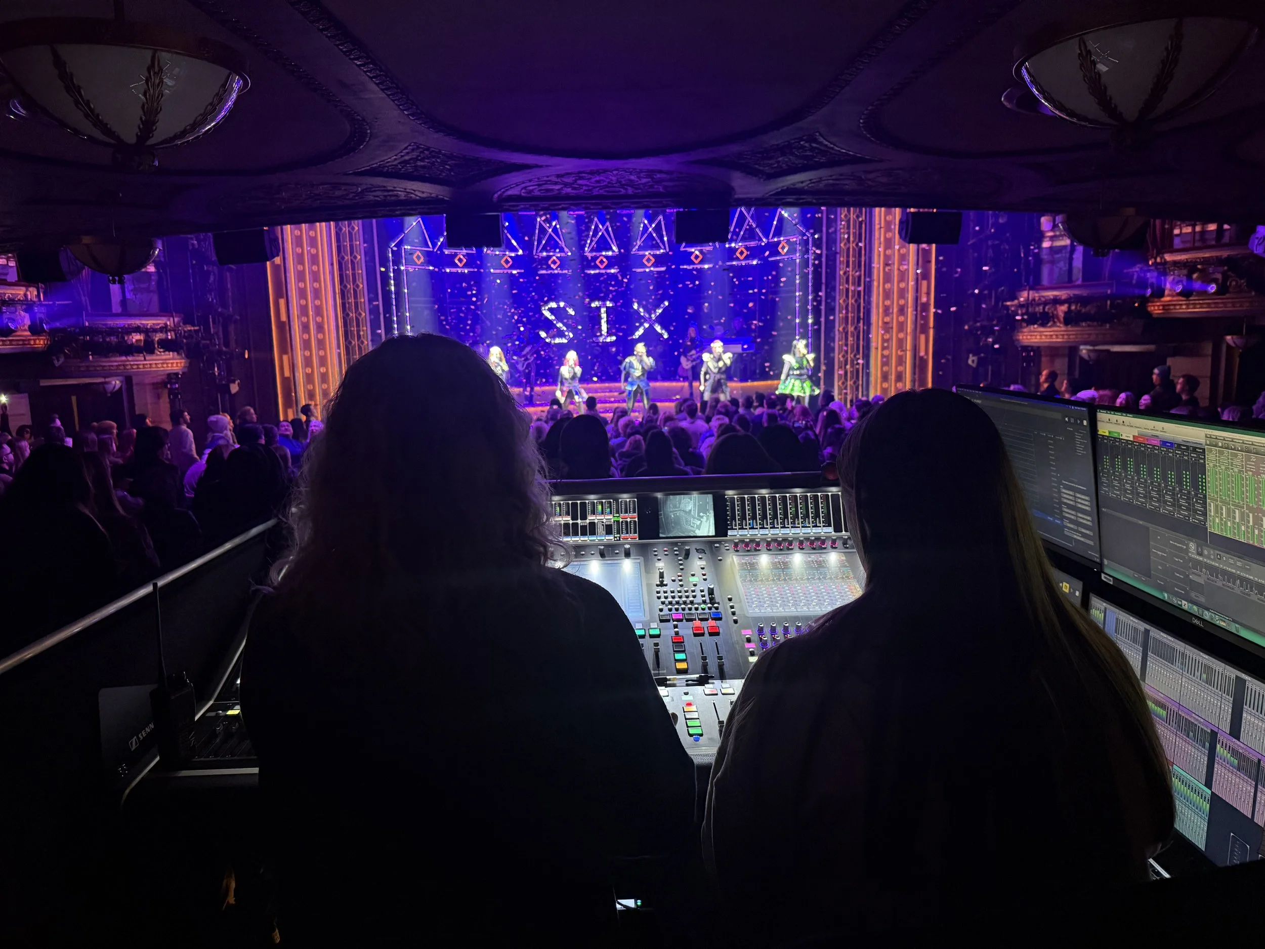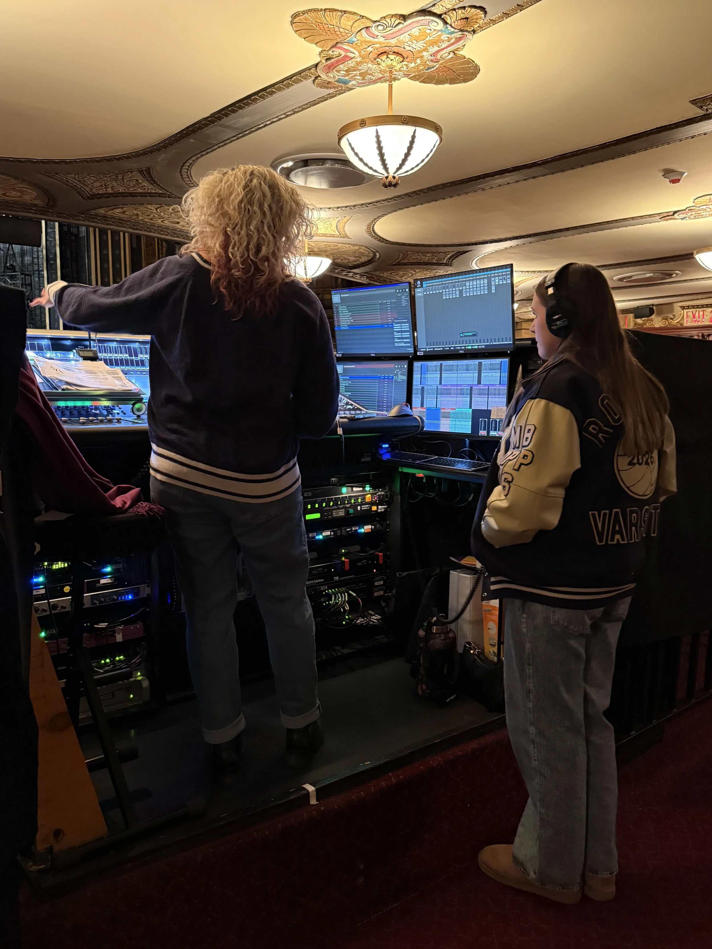 In early 2026, I was introduced to Julie Sloan, a sound engineer for Broadway shows including Disney’s Aida National Tour and Jersey Boys since its creation in 2005. She is currently working on Hamilton and SIX on Broadway. Julie generously invited me to observe her mix both of these musicals so I could see the live audio side of the music industry. I went to SIX first and I learned so much about the differences of handheld microphones compared to body mics on the forehead. I was also able to see the ear pieces for each character, as well as the zactrack SMART system used to track each performer’s motion and correlate it to the speakers around the theater for an immersive audio experience. I loved getting to see the process before the show starts, checking all of the microphones, and the systems they use to communicate to people backstage during the show.