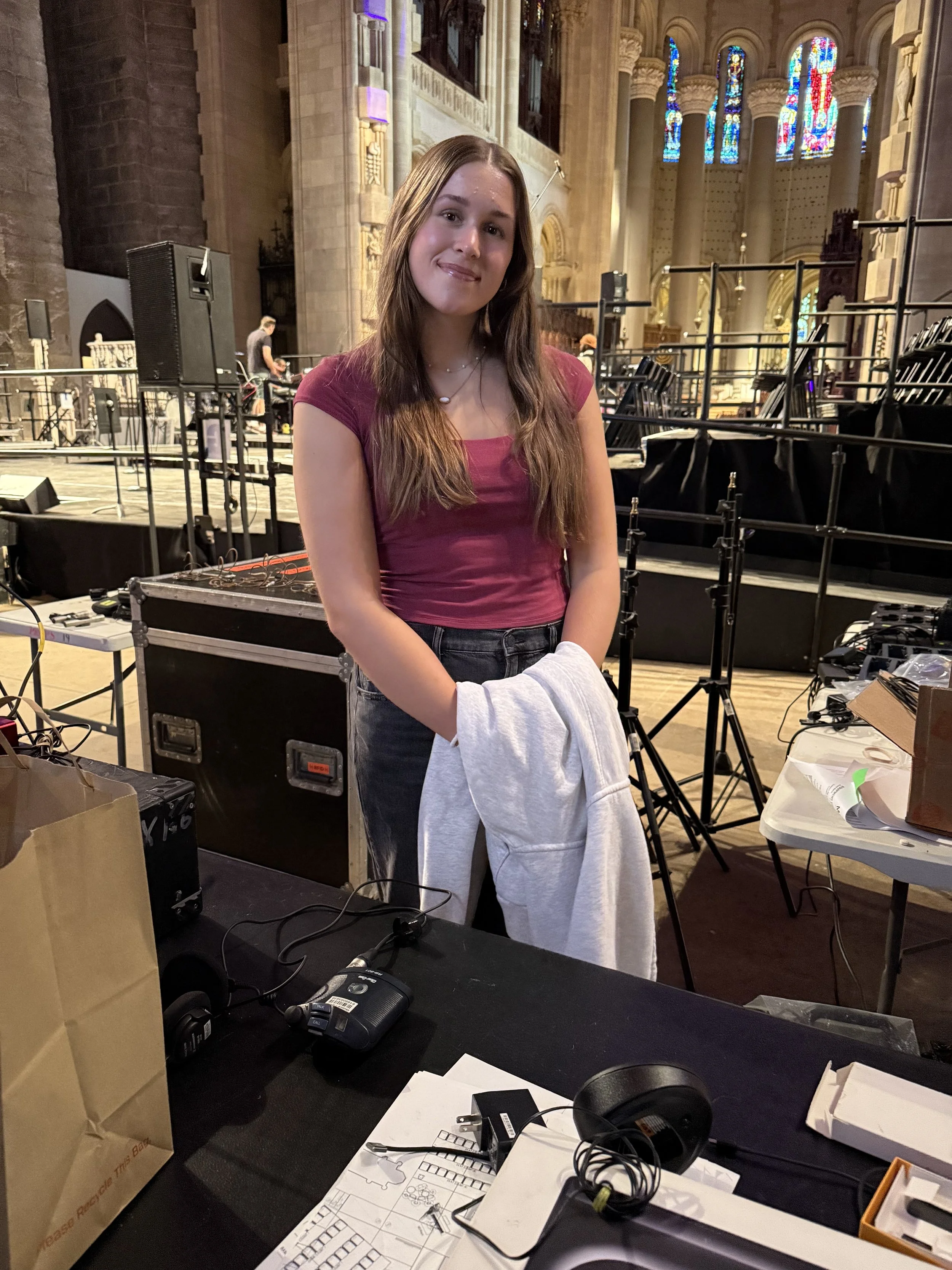 In the fall of 2025, I was invited to take part in some true hands-on experience with Tony Award-nominated Sound Designer Walter Trarbach. He and I met at the beautiful Cathedral of St. John the Divine, where we worked together on setting up for a Public Works concert experience inspired by Shakespeare’s Pericles. I was able to work with all types of new sound equipment, from audio cables to headsets, and was thrilled to discover a new side of the industry in an unconventional performance space.
